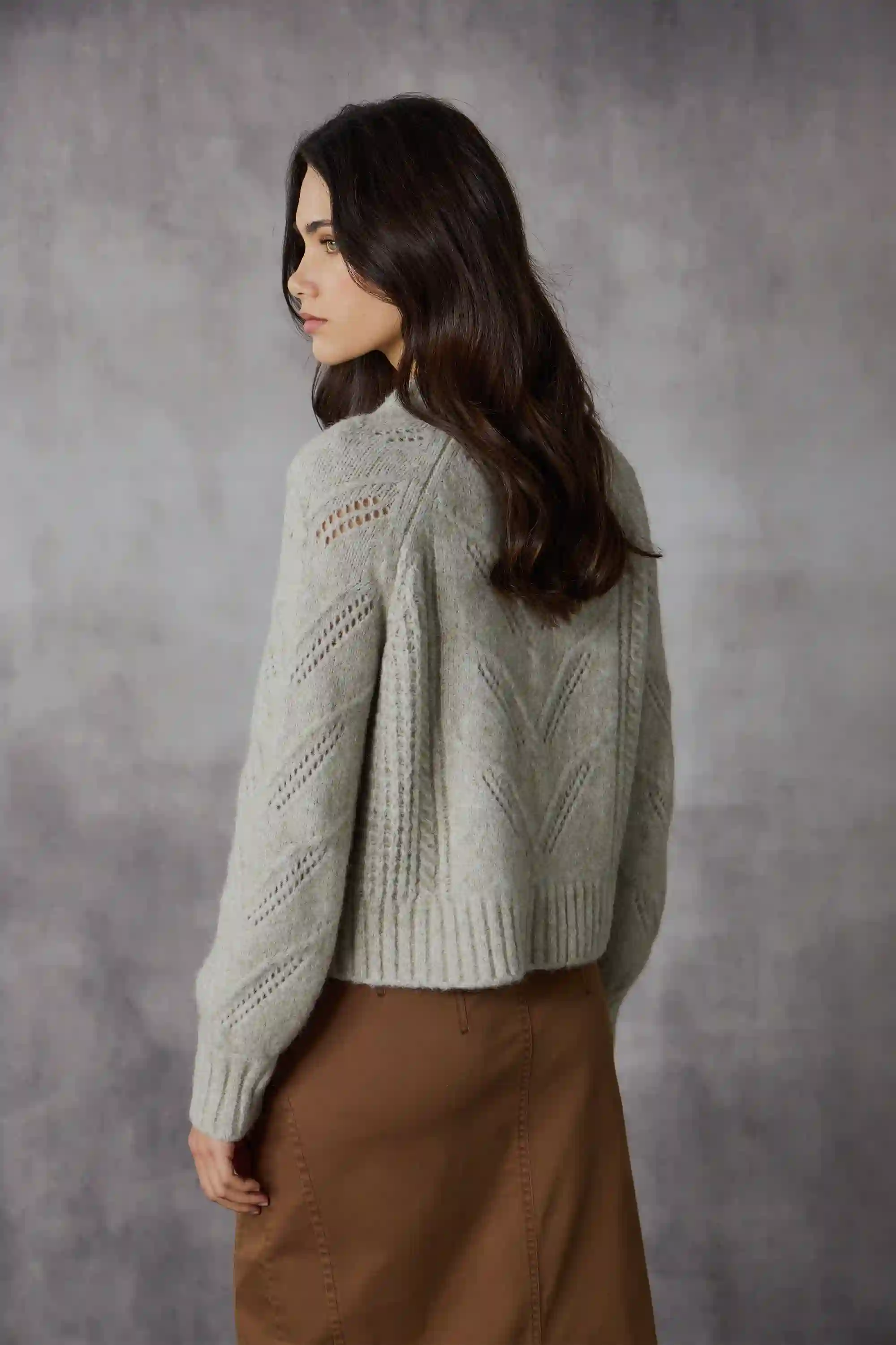 The Capella Cardi combines cozy chic with modern style. Crafted from a soft wool-mohair blend, featuring chunky cable knit, a ribbed neckline, cuffs, hem band, and bronzed metal buttons, this versatile piece blends warmth and elegance effortlessly.