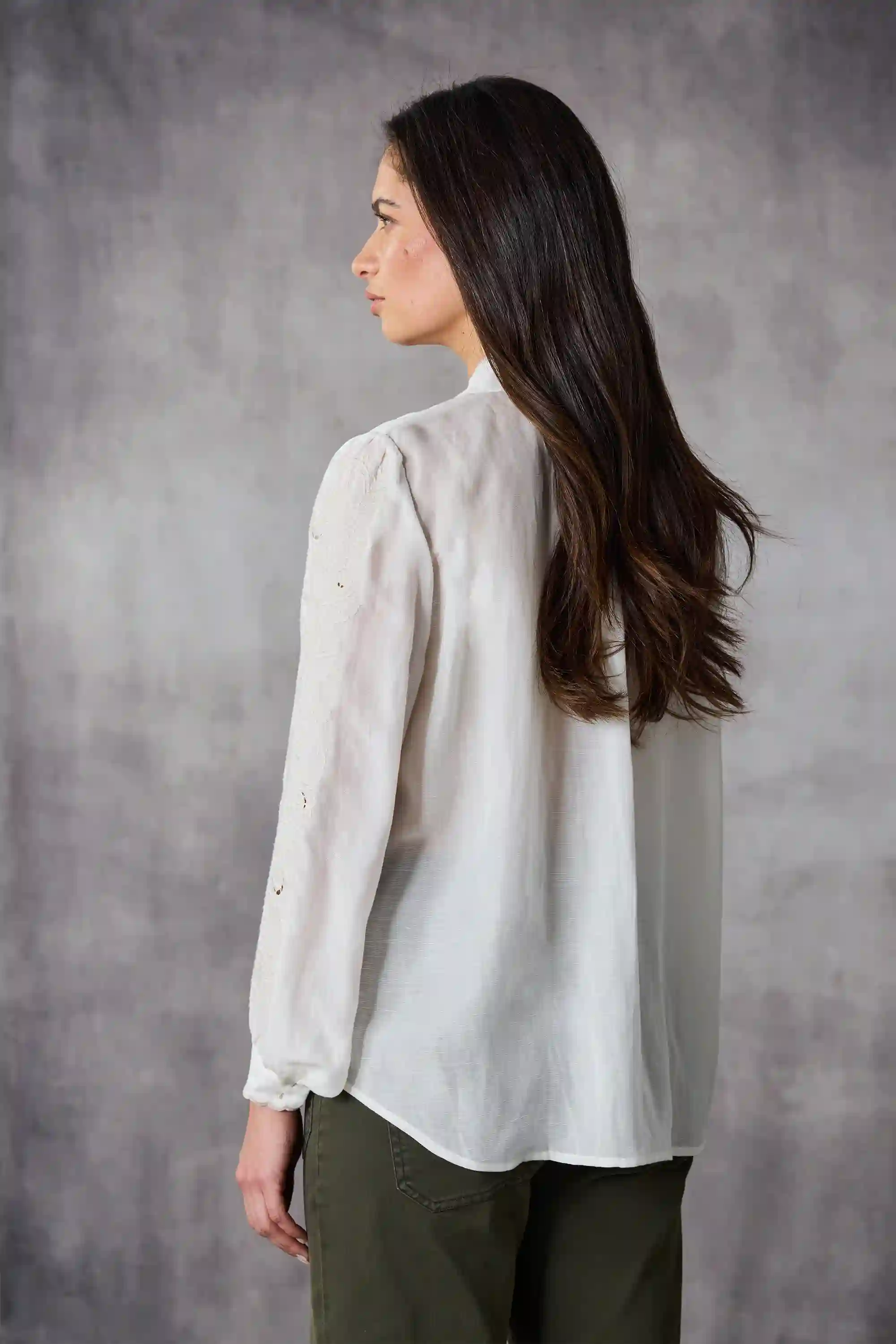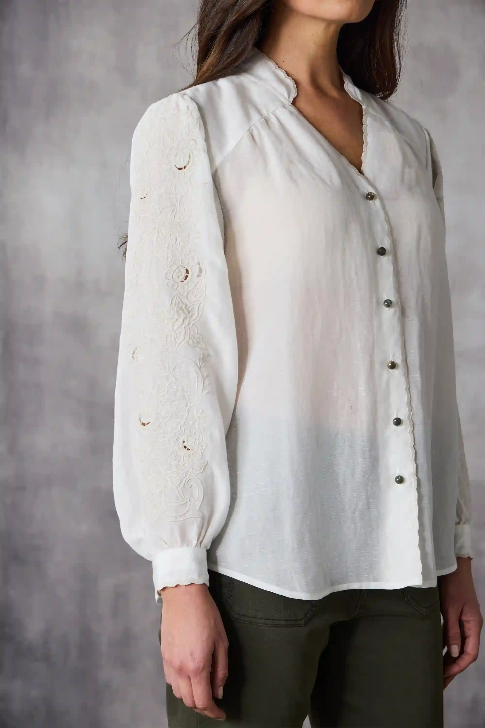 The Dash Shirt is a must-have for Winter and can be worn for both work and leisure. Its design celebrates femininity, with exquisite ornate embroidery on the sleeves, a central front placket adorned with charming dome-heading glass buttons and a delicate