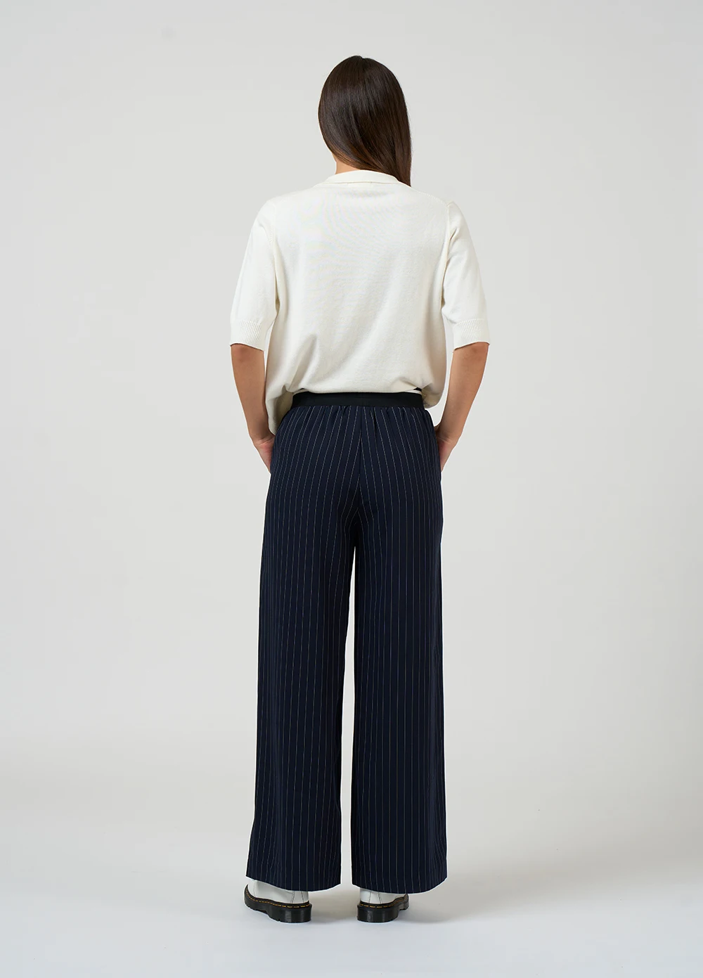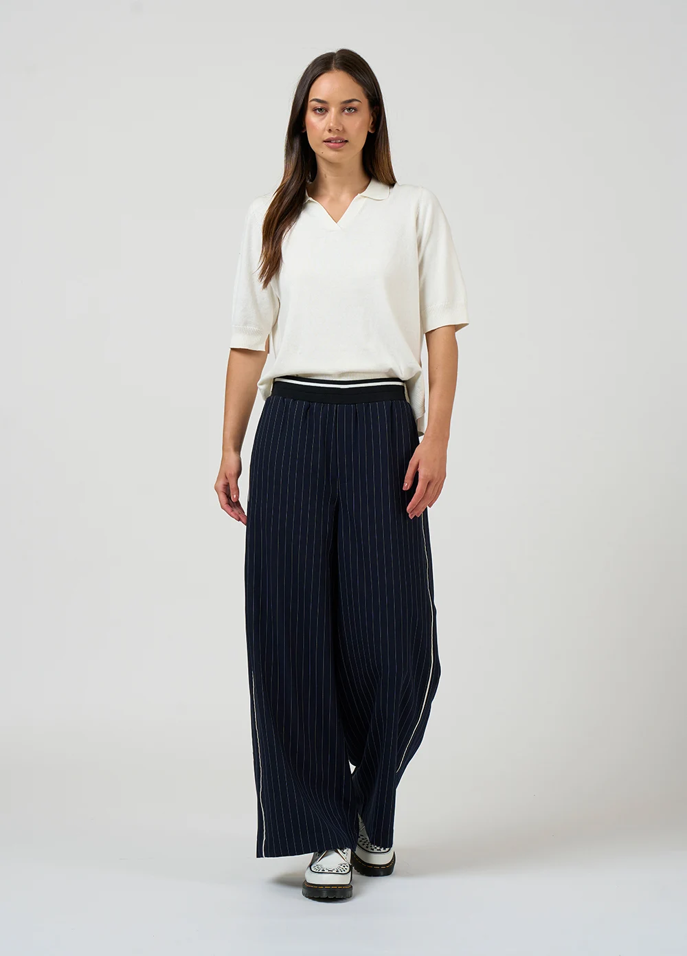 Wide leg pull-on pant with a stripe rib waist band and contrast piping at forward side seams. Functional front pockets.
