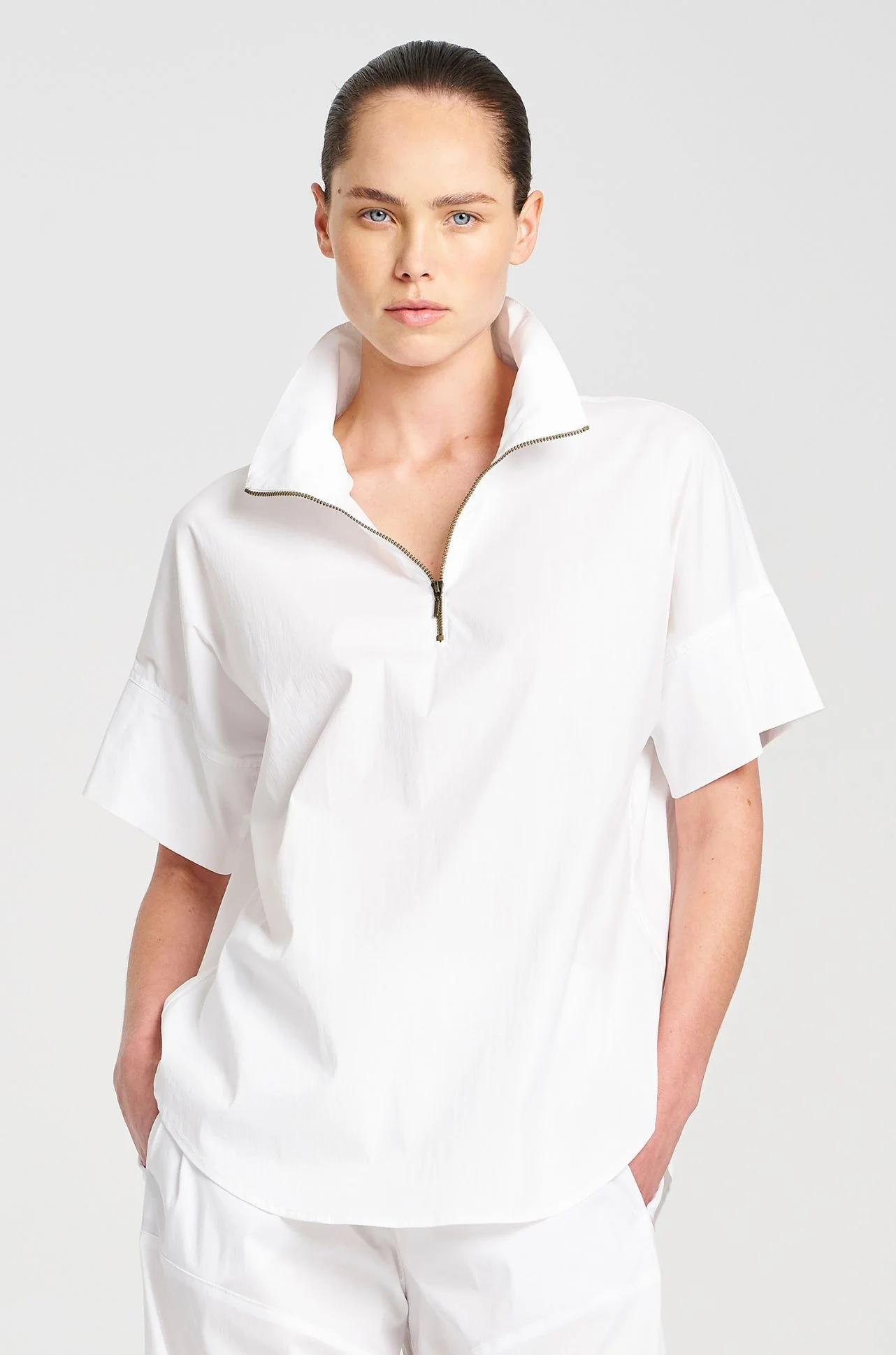 “Cut in Mela Purdie’s Lightweight Microprene, A crisp, cotton rich fabric with high stretch and a polished finish. The Half Zip Shirt features a high collar stand with zip through detailing.