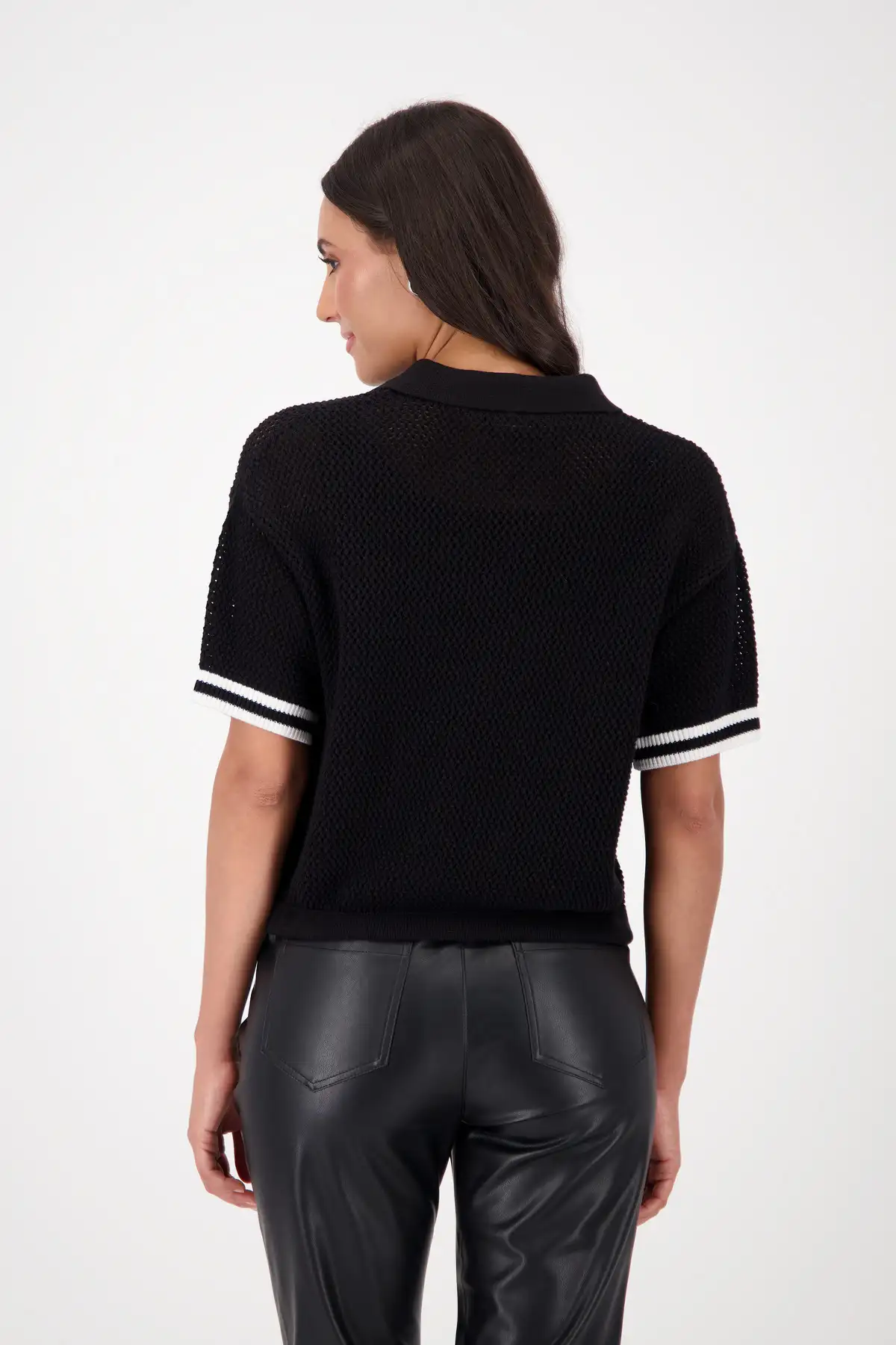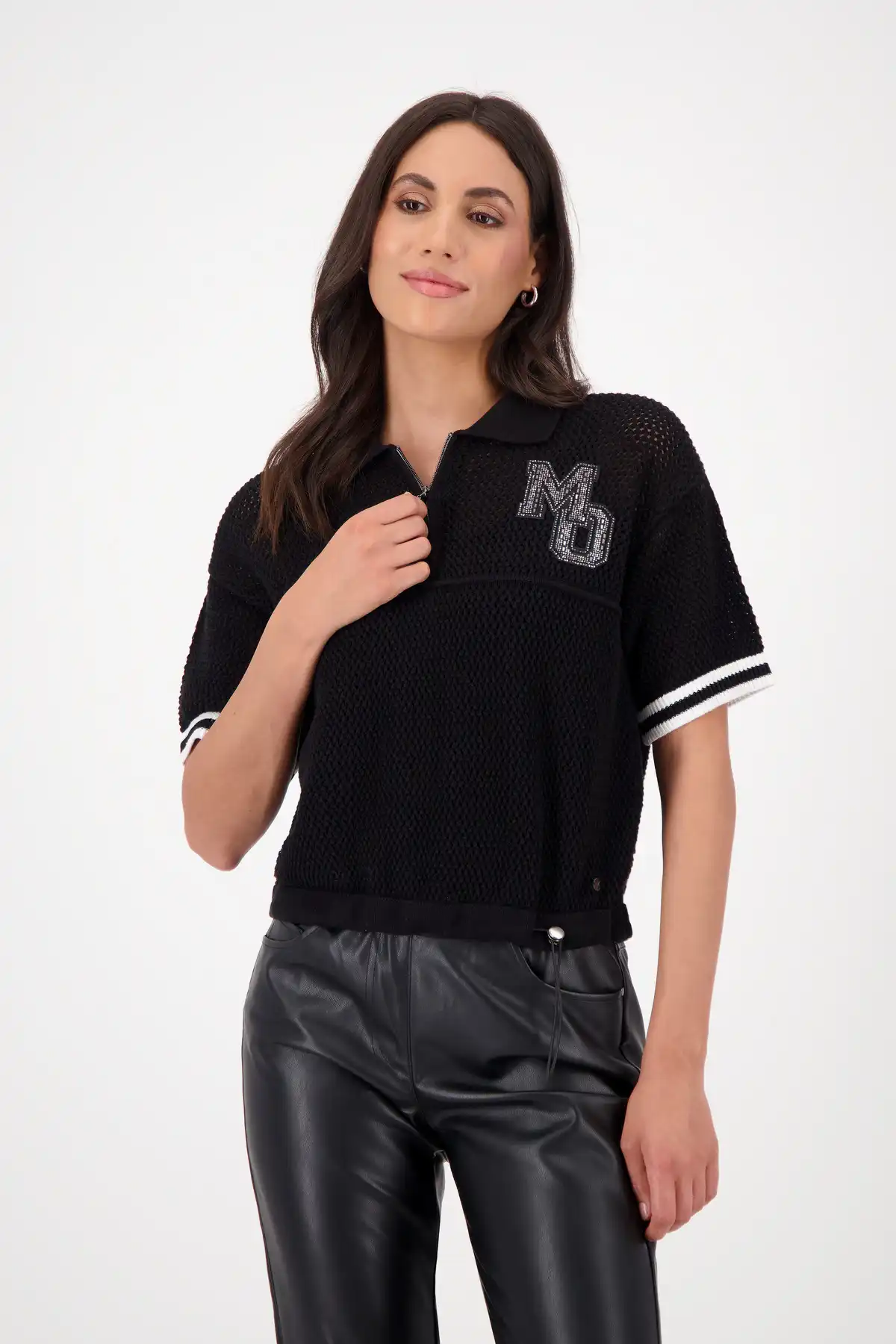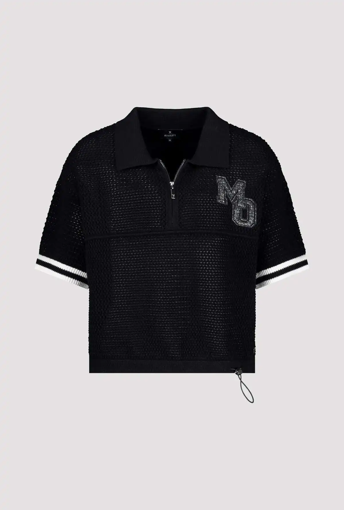 Knitted shirt made of 100% cotton with an airy ajour pattern and sparkling rhinestones for stylish accents. The polo collar with zipper and elasticated hem add a sporty touch.