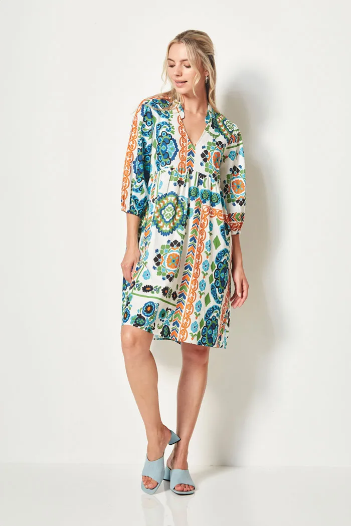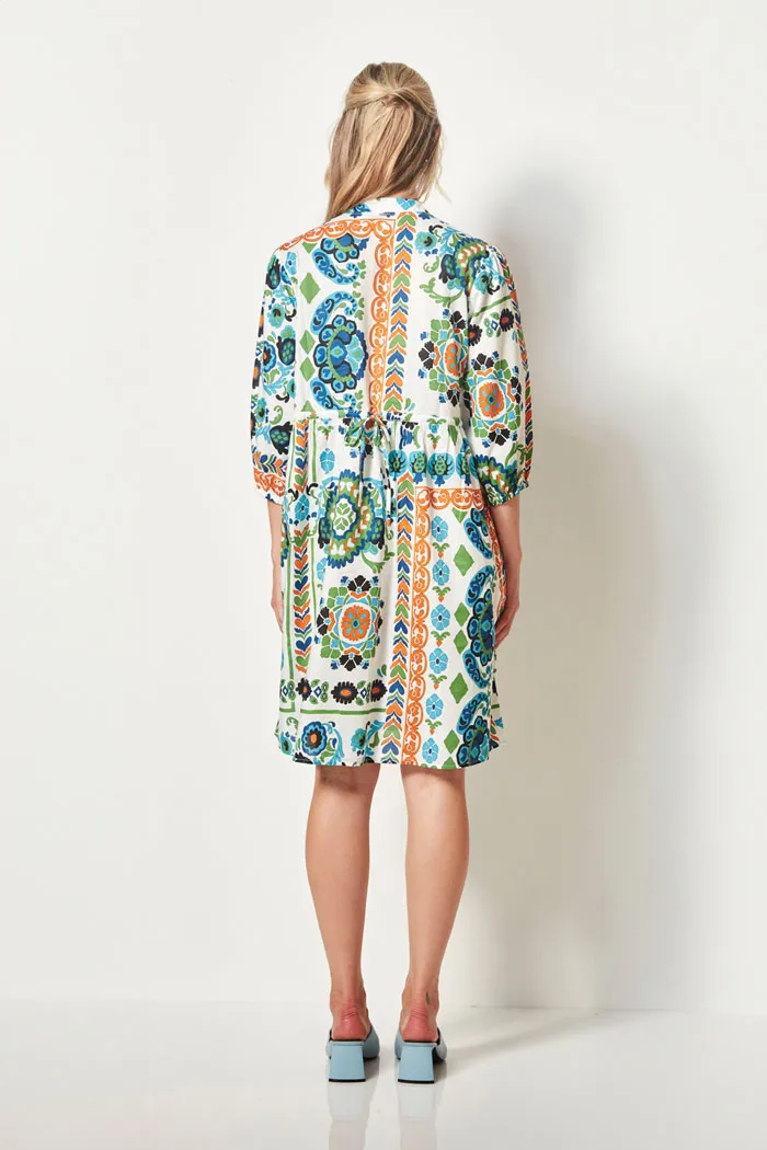 100% Cotton twill Fiesta print dress with low Mandarin collar and V neckline. Set in sleeve is softly gathered at the shoulder and falls below the elbow with elasticated cuff. The Fiesta Dress is angled at the waist in the front and has tie at the back waist. The Fiesta dress falls to the knee.