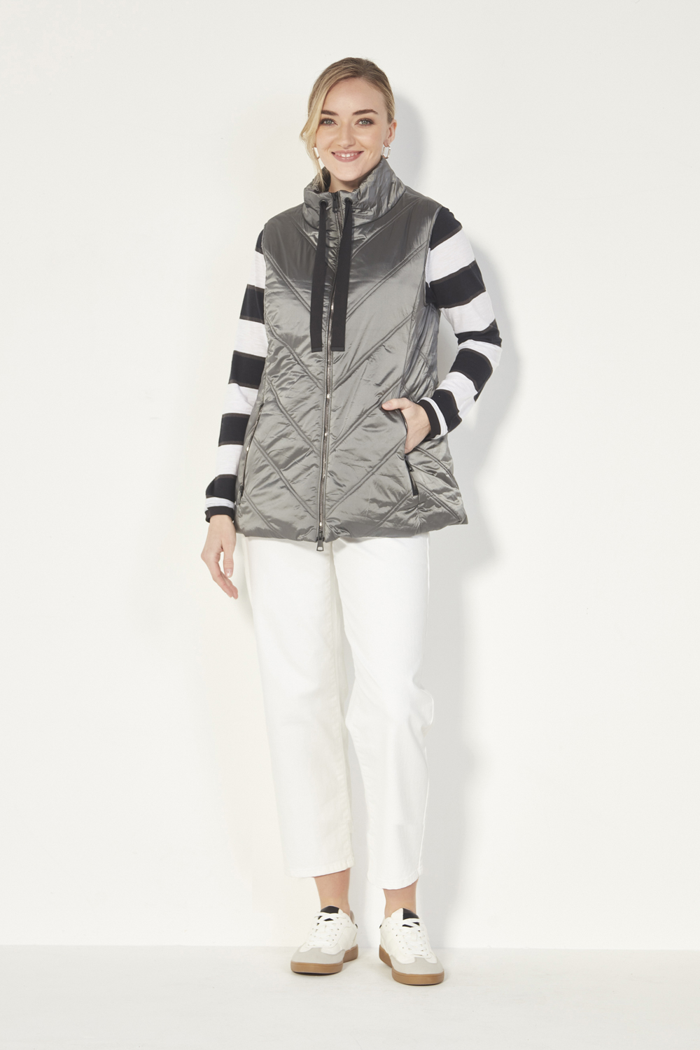 Transform your style with our Outkast Vest. This metallic look shot vest features a zip front and high collar for a modern edge. Stay warm and on-trend with fleece-lined pockets and a shaped body that falls below the hip. Upgrade your wardrobe today! Metallic quilted puffer vest. High neckline. Contrast neckties.